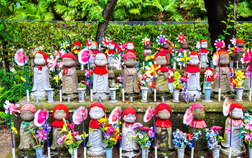 Zojoji is famous for being the grand temple sitting a stone’s throw away from Tokyo Tower. But aside from its picturesque exterior, this temple holds a lot of history, holding the mausoleums of multiple warlords and dating back to 1590 when it was relocated to its current location by a warlord, Tokugawa Ieyasu, who brought around the Edo period and made Tokyo the capital of Japan. Zojoji used to be far larger, with multiple schools on its ground, but unfortunately, most of that has been lost to time, war, and natural disasters. This is all except the front gates which have stood strong since 1590 and are the oldest wooden structure in Tokyo. To the side of the main building, you can also spot 1000 Jizo statues. These are small stone statues, often wearing knitted hats with colorful spinning flowers in front of them. These statues are in remembrance of stillborn babies and miscarriages. Parents can purchase items for the statue to remember their little ones.