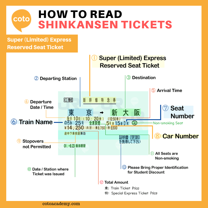 On the ticket, you will find several key pieces of information related to your train reservation. Below we provide a list of the Kanji and Vocabulary needed for both of the reserved and non-reserved tickets.