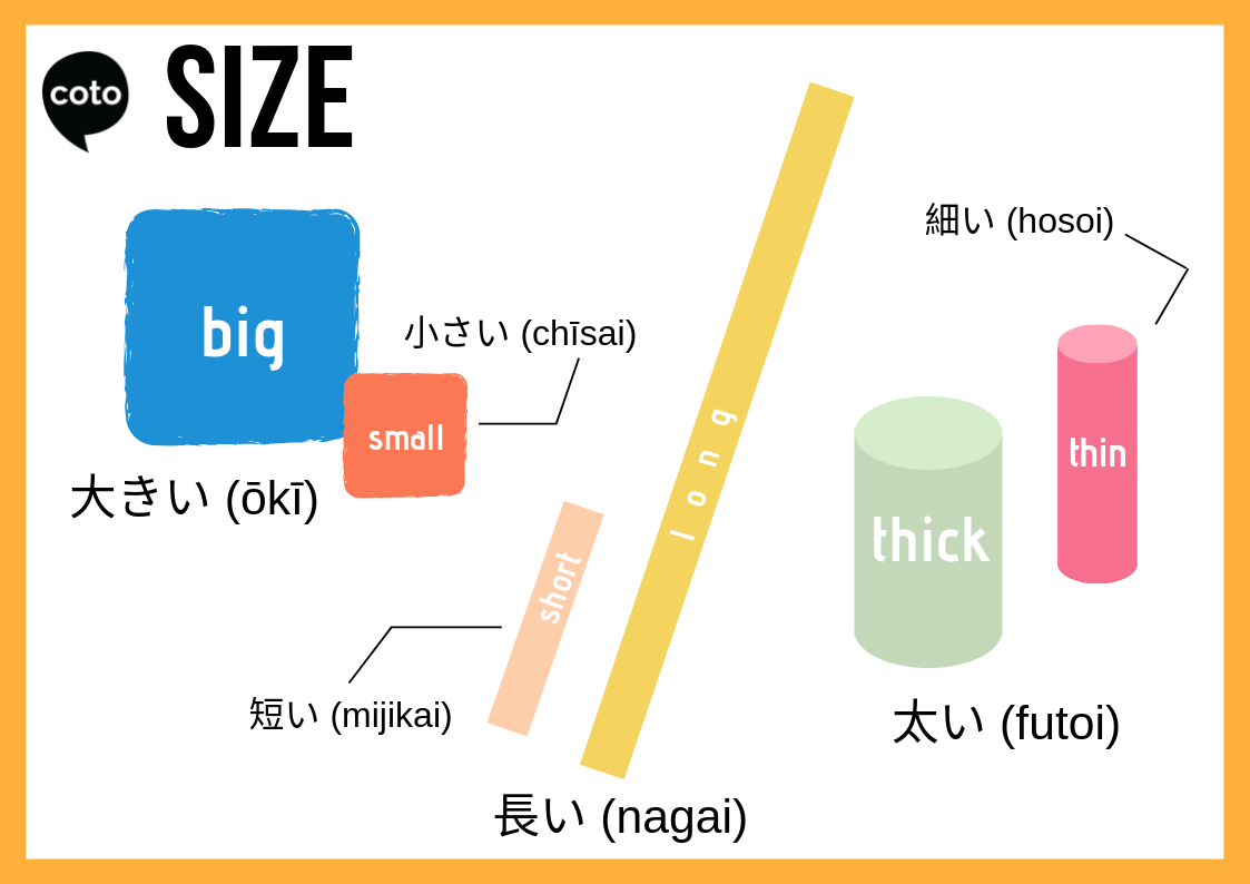Below we have included a list of vocabulary words and several infographics that will teach you the words you need to describe size, length, width and more in Japanese.