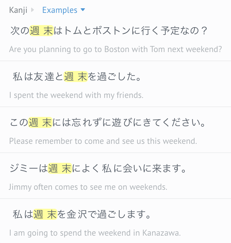 It also provides other kanji examples, the associated JLPT level and more information of “kun” and “on” reading of kanji. There is a tab called “examples” next to “kanji” that provides more example sentences of the highlighted kanji. This feature is very beneficial in allowing Japanese learners to gain the skill to use the vocabulary naturally .