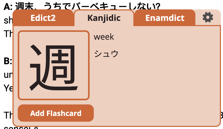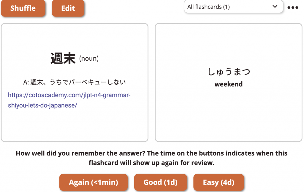 Another superb feature is the ability to add kanjis you have encountered into flashcard. The flashcard tests you on the kanji reading, and when you have answered the quiz, the extension gives you a survey to answer how well you have remembered the answer, for future reference of how often the vocabulary should be seen.