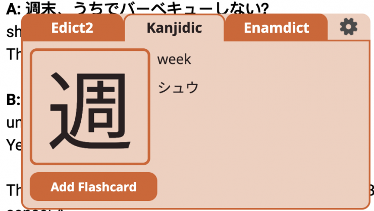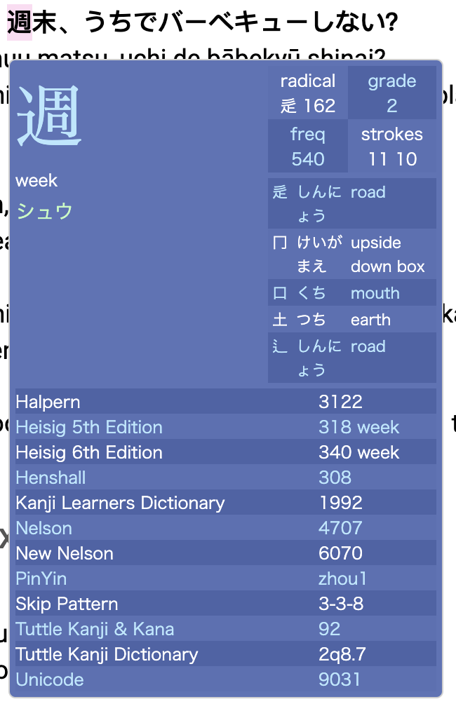 Whilst hovering, click “shift” or “enter” to switch the dictionary to a kanji dictionary where it provides information on the individual kanji.