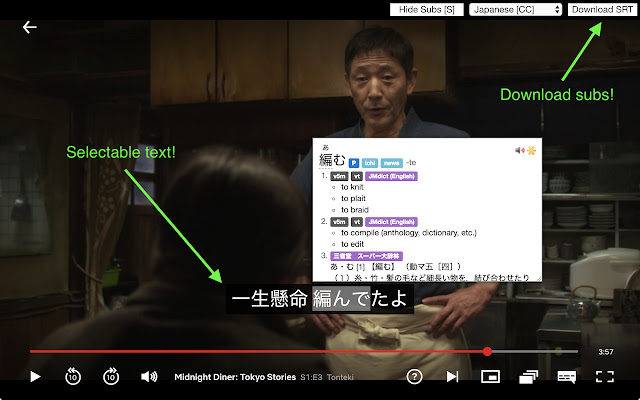 Another advantage of this extension is that the subtitles are displayed as a selectable text, meaning that you can copy and paste the words and use hand in hand with the Rikaikun extension for more definitions.