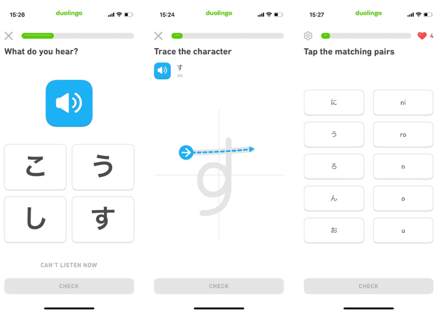 It’s important to note that Duolingo does not introduce the letters in ‘alphabetical’ order. For instance, the first set of ひらがな characters you’ll learn are す、し、う、and こ.