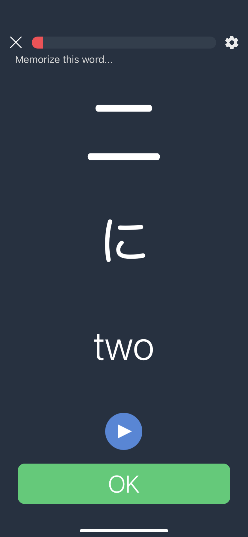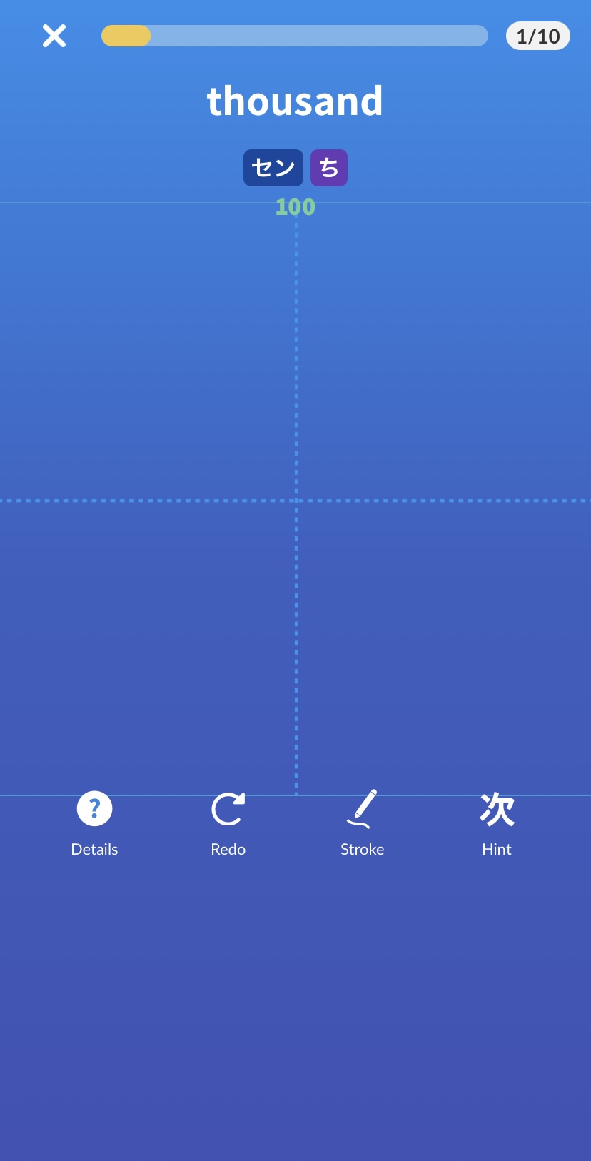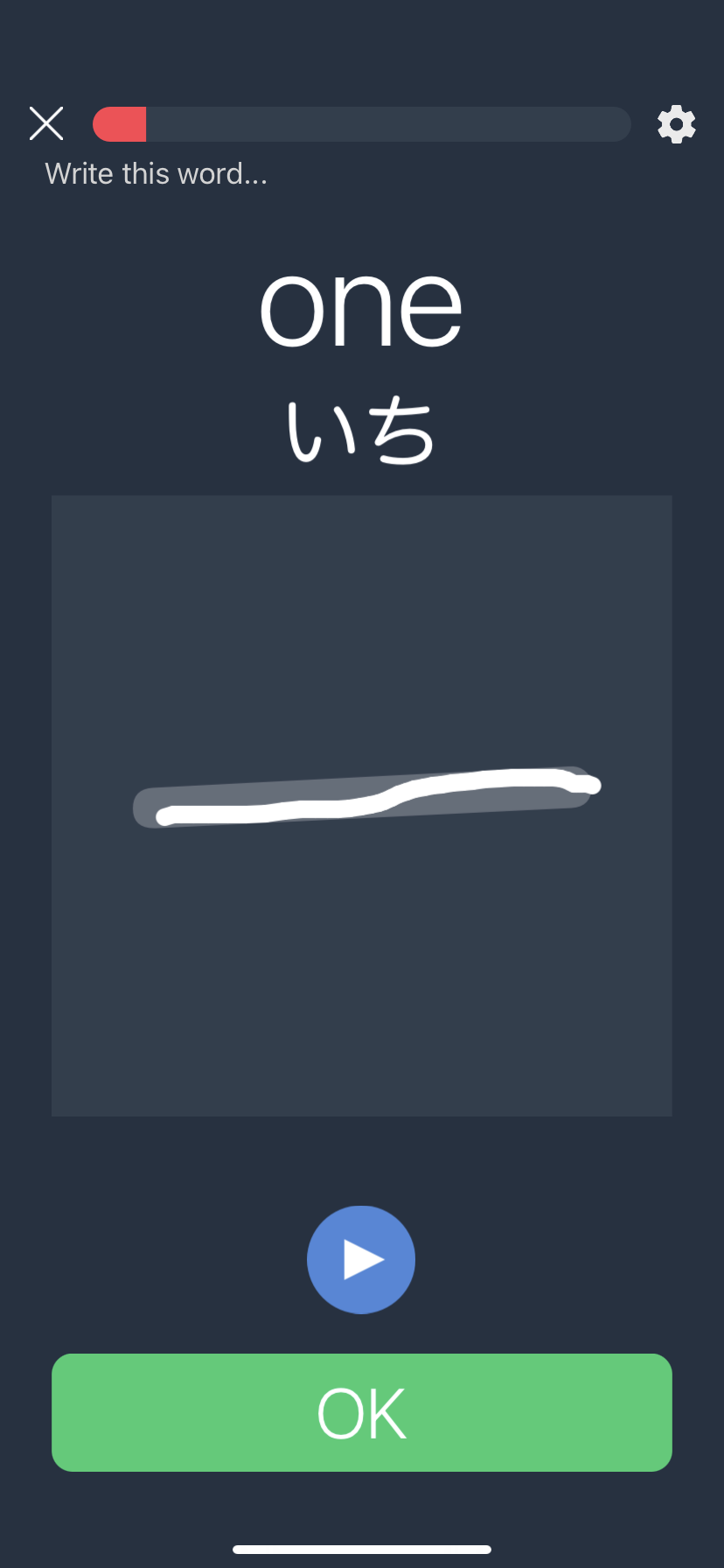 The order of study method with this app is, they first give you two vocabularies they want you to remember. In this case, it is the two kanjis 一(ichi) and 二(ni). Both flashcards contain the kanji, the hiragana reading and the English translation. Each flashcards also have an audio playback function. When you proceed, the app asks you to write and trace the given kanji.