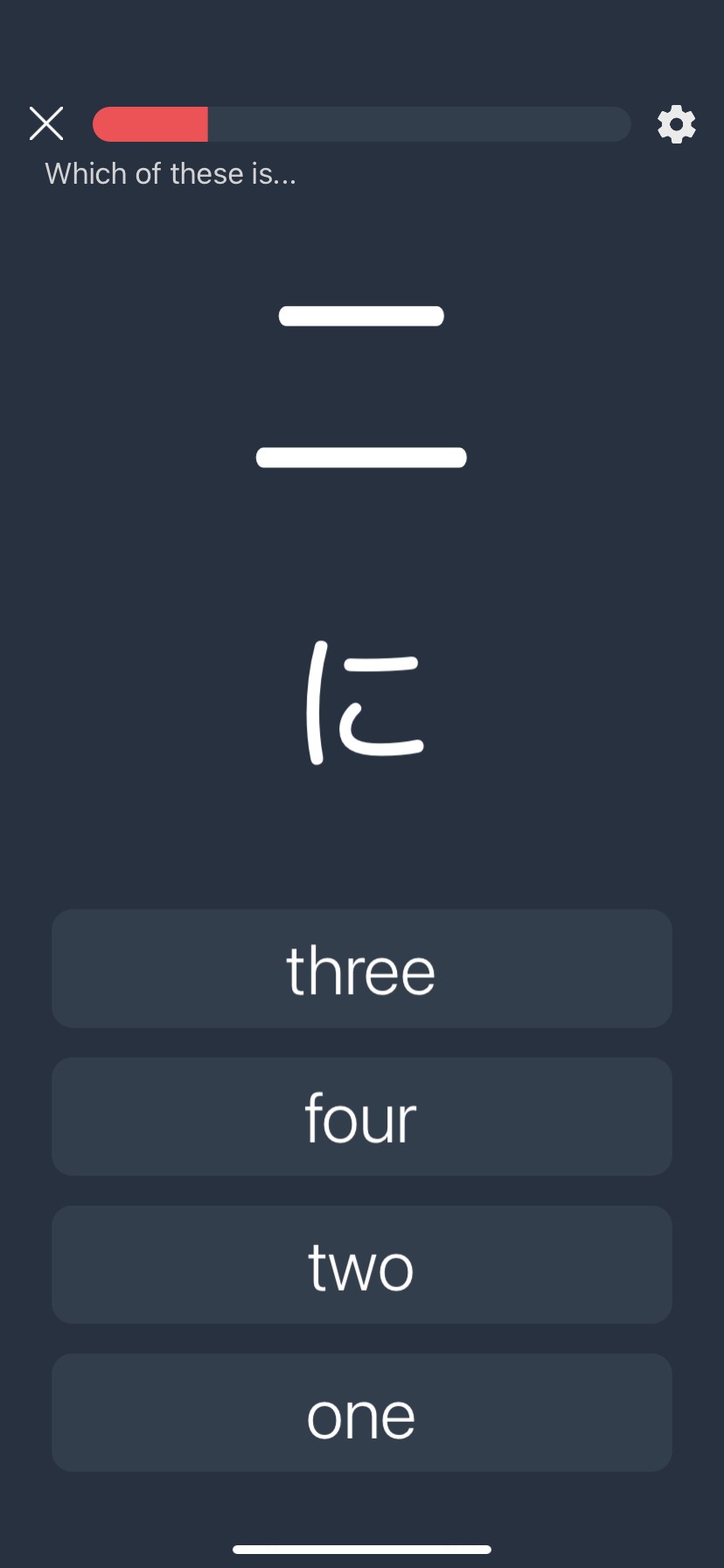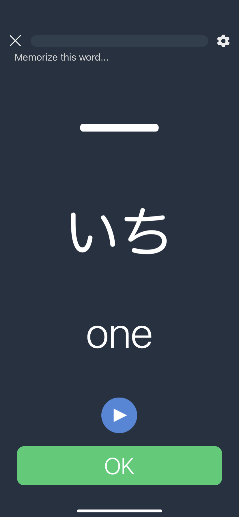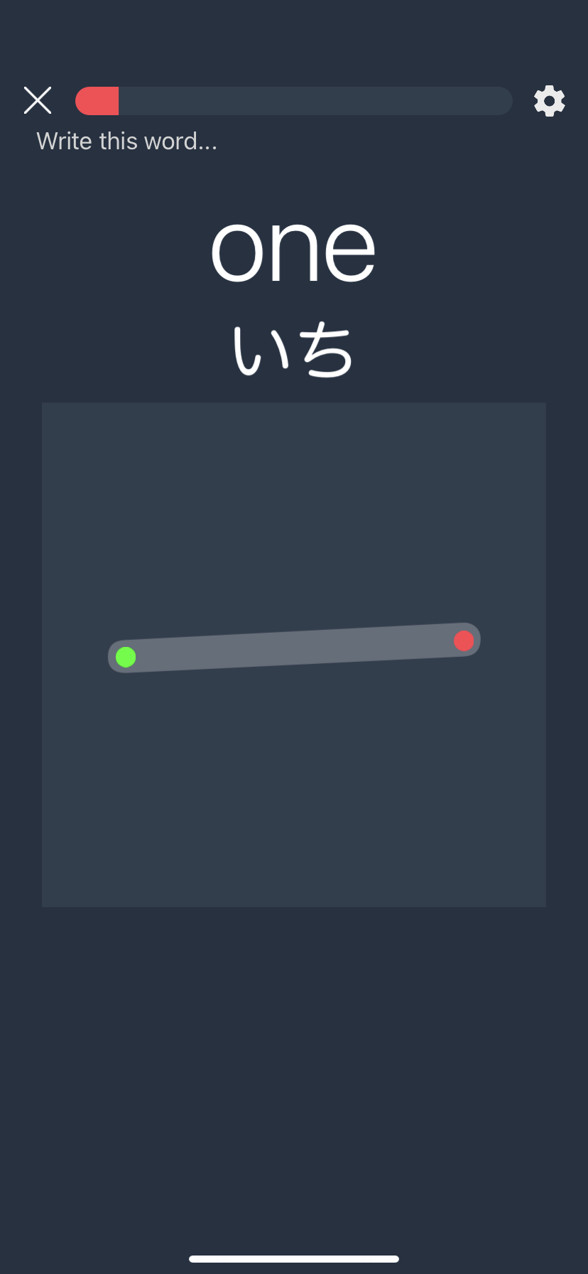 The order of study method with this app is, they first give you two vocabularies they want you to remember. In this case, it is the two kanjis 一(ichi) and 二(ni). Both flashcards contain the kanji, the hiragana reading and the English translation. Each flashcards also have an audio playback function. When you proceed, the app asks you to write and trace the given kanji.