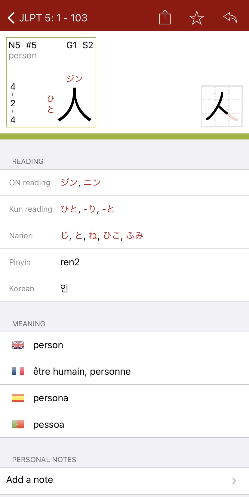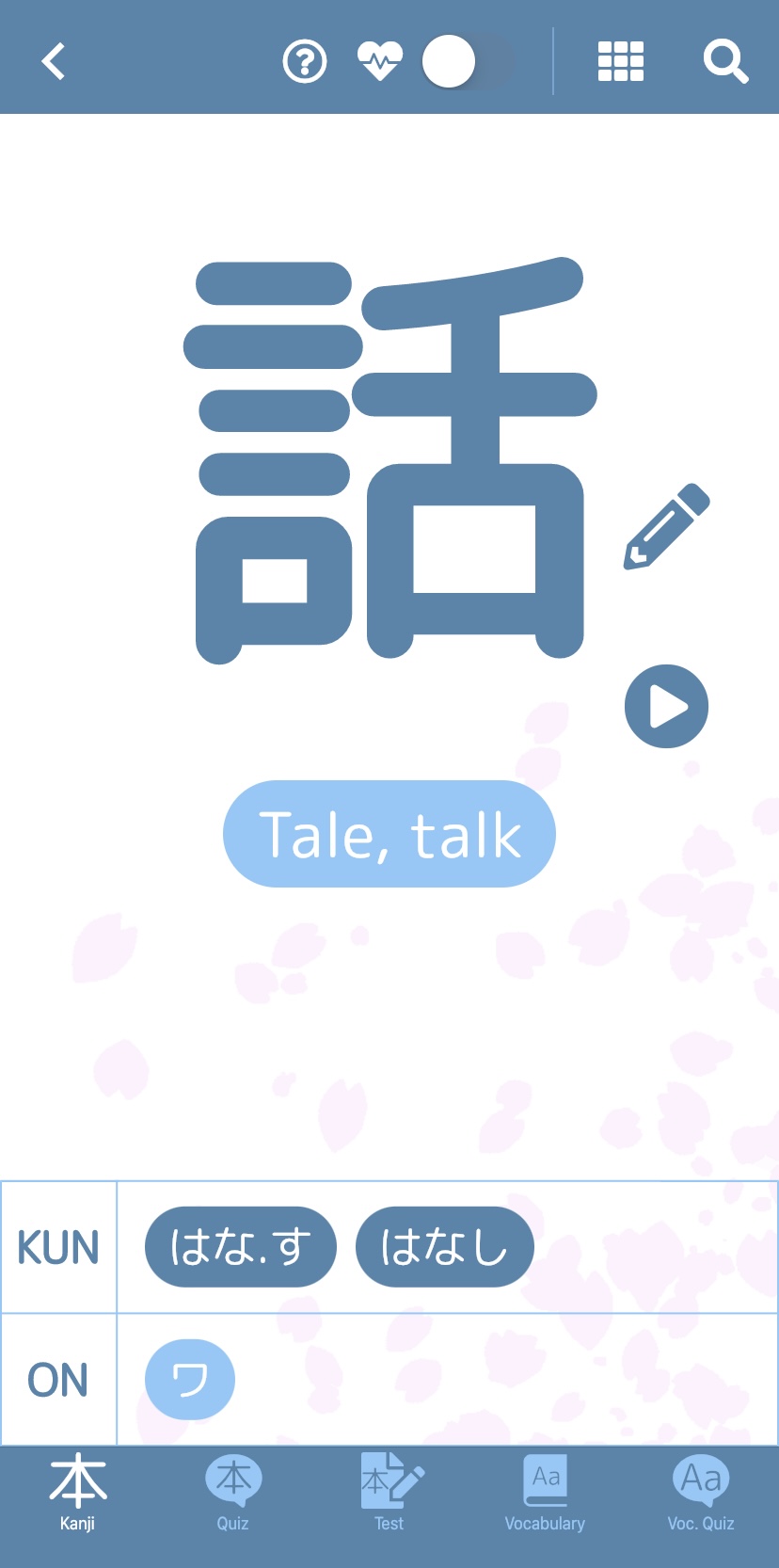 This app serves as a vocabulary dictionary. Users can look at N5 kanji, understand the meaning in English, as well as memorize the multiple “kun” and “on” readings of the kanji. When studying for the kanji, there is play function, where users are able to see the stroke order of the kanji. The users then can select the pen function where there is the kanji guided line for users to practice writing it themselves. Another benefits of this study app, is that while tracing the guided kanji lines, there is a green and red circle at each end, signaling where to start and end. This is very helpful in helping Japanese learners write the kanji not only for the correct stroke order, but stroke direction as well.