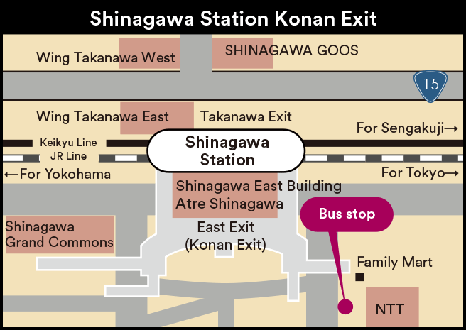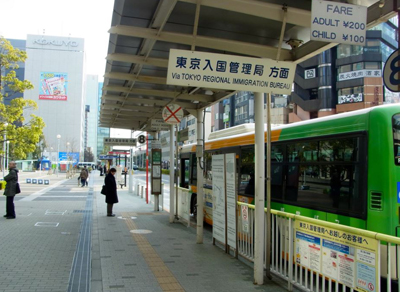 The Tokyo Regional Immigration Bureau Bus is the #8 bus – which can be found by going left on the walkway and taking the stairs down in-front of the family mart from the Konan (East) exit of Shinagawa (品川) Station. You can see how to get there from the image above – as well as the google map below – all of the blue bus icons are different stops and you will see the #8 bus marked as in the photo above.